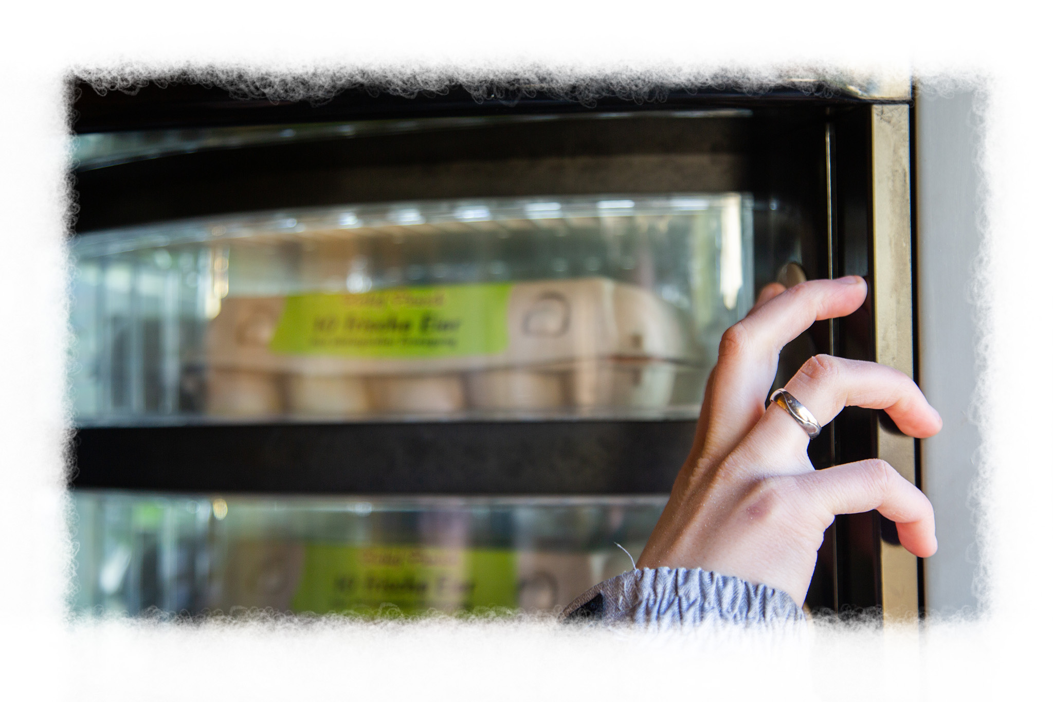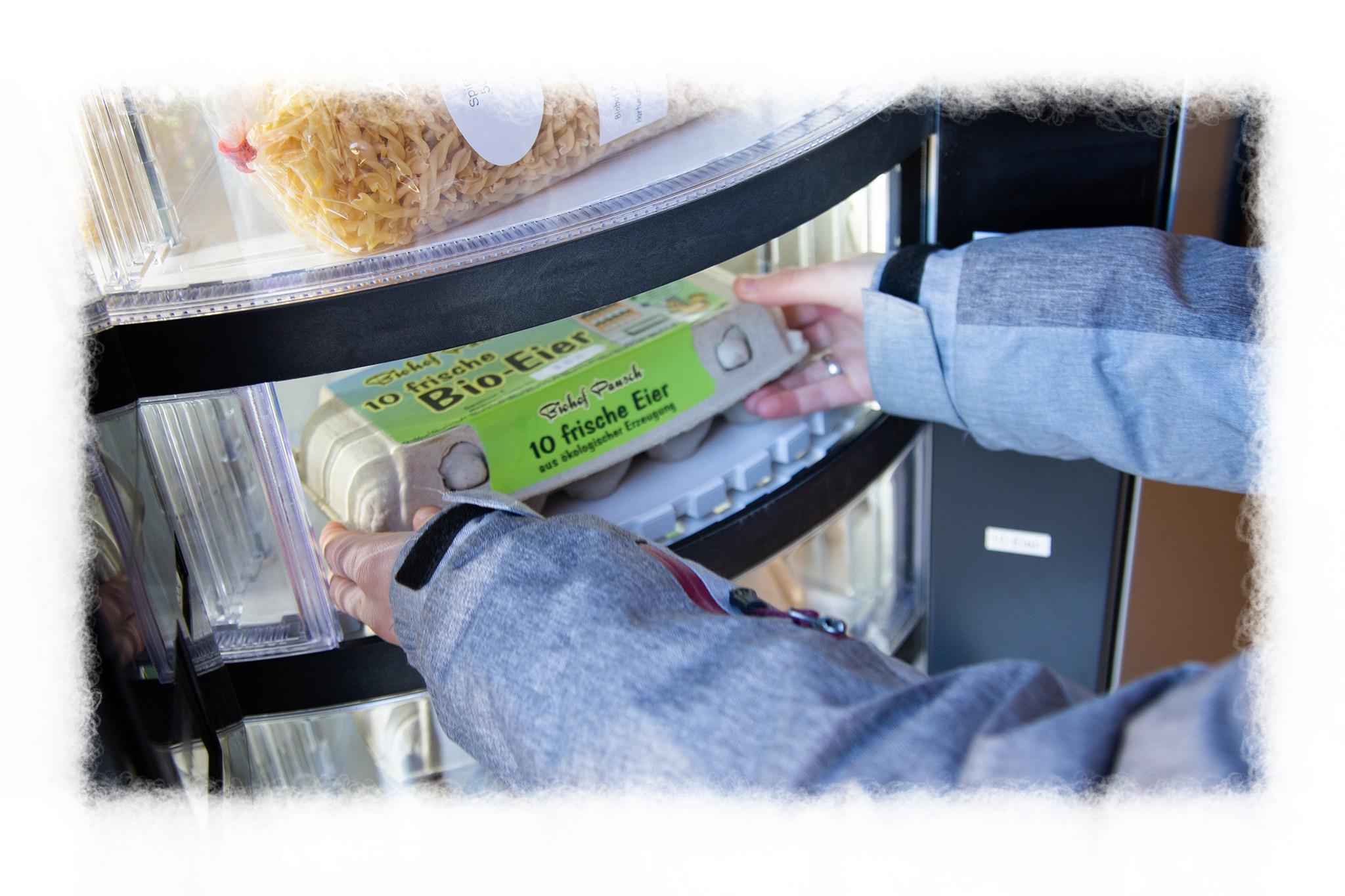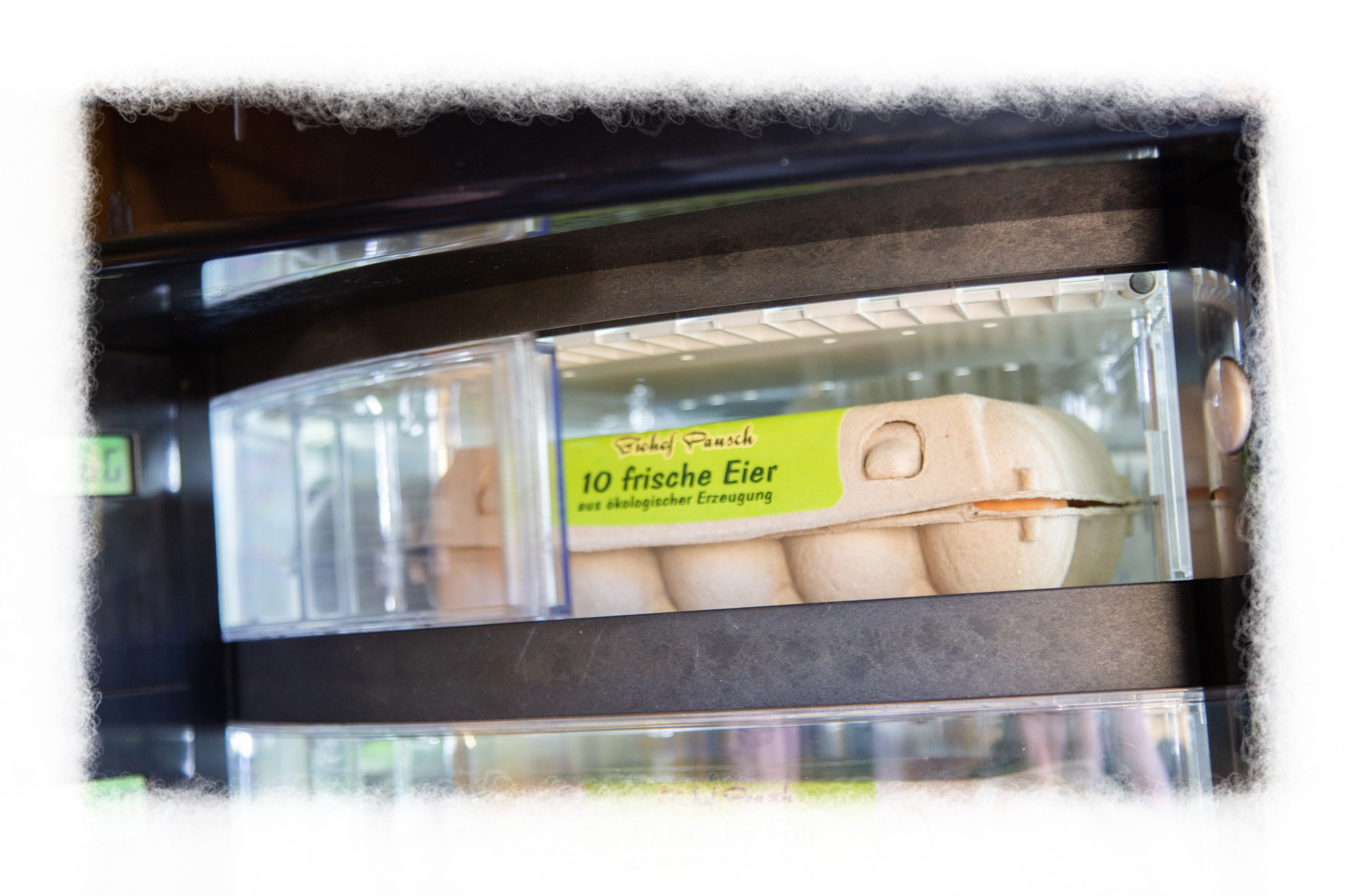 Das Fach öffnet sich automatisch. Entnehmen Sie binnen 20 Sekunden die Eierschachtel oder die Nudeln. Keine Sorge, wenn es Schwierigkeiten gibt, klingeln Sie bei uns an der Haustüre.